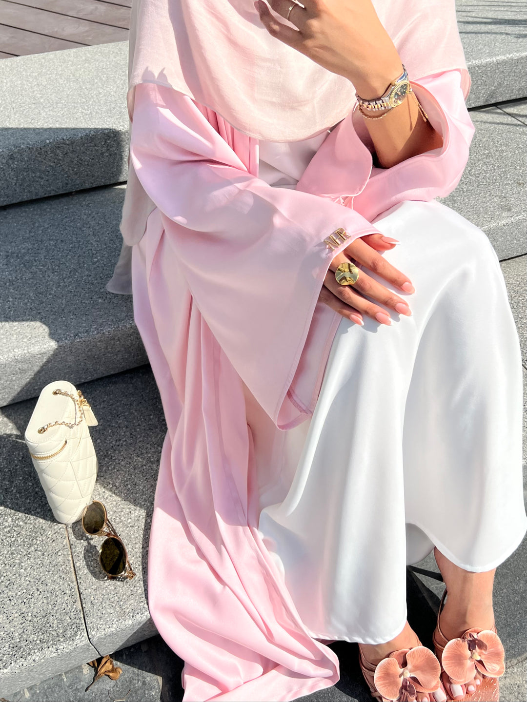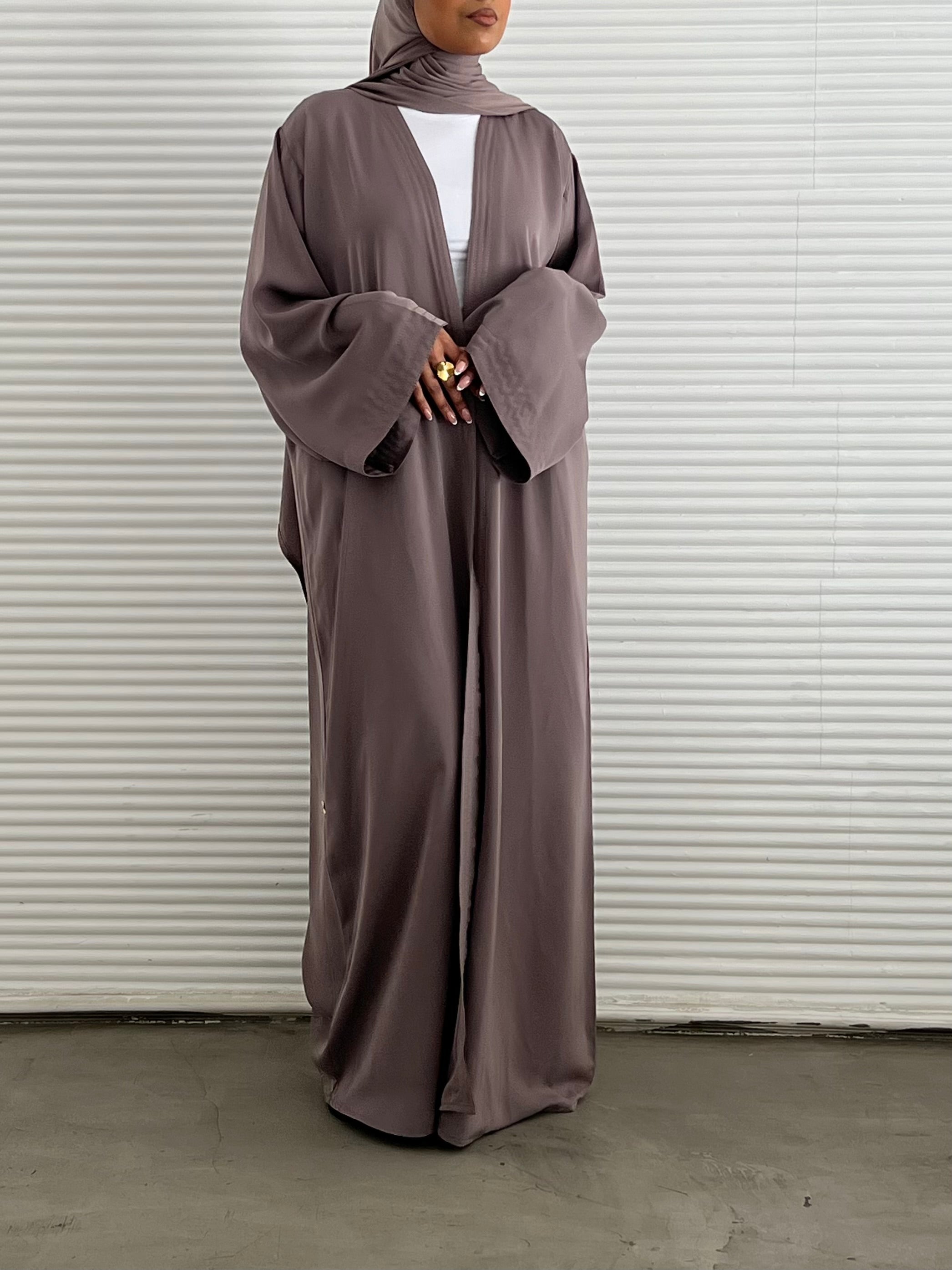 Our model is wearing the petal blush abaya with the serene dress, we love it !
